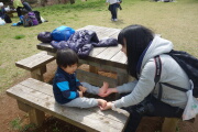 子供たちは満足な山頂タイムだったと思います。岳くんはトーマスマットを敷いて、持参の岳ごはんを食べます。
