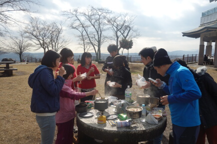 展望台からメンバーの写真を撮っておきました。お腹がいっぱいになったところで、弘法山を目指します。