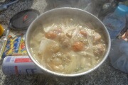 酸っぱい鍋と辛い鍋でタイ料理のトムヤンクン鍋の完成です。まー、うどんが合わないって結論で終了。