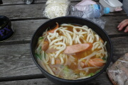 山頂前にトラップのピンクのリボンの木があるので注意です。本日の山ごはんは李さんのカレーうどんです。