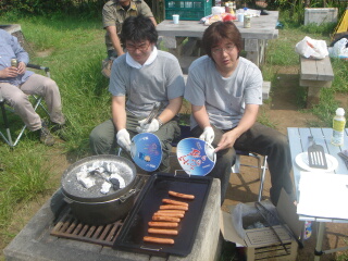 お父さんは料理を作ります。宮内はホットドッグ担当でソーセージを焼き、