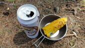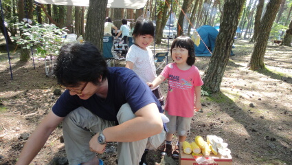 昼食担当は鈴木家です。焼きとうもろこしを時間をかけてじっくり焼いております。