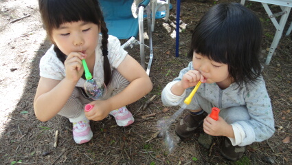 朝食後はシャボン玉で遊びます。ゆゆちゃん&みくちゃんの遊びで一番面白かったのは、かくれんぼ。