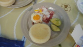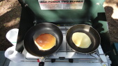 ベーコンエッグ&アボガドサンドとホットケーキを作ります。「美味しい」と女性人には好評です。