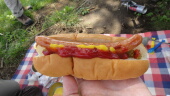 昼食の担当はスーさんです。ホットドッグとコーンスープです。涼しい陽気で、スープも美味いです。