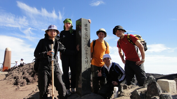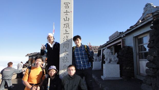 1日目の山頂で集合写真です。吉田ルートは登りやすくてサングさんに騙されなければ快適でした(笑)