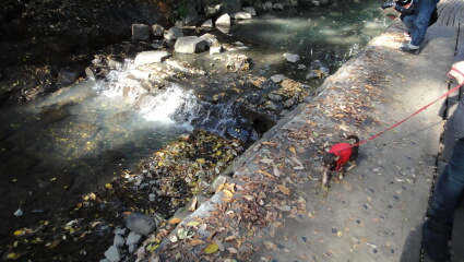 世田谷側は犬連れ散歩も多いです。いきなり、マロンちゃんはヒジキという犬に襲われてビビリます。