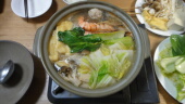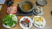 嫁さんに抱っこしてもらって帰ります。夕飯は昨日もらってシャケを使って、塩鍋です。