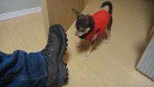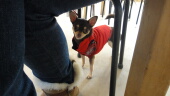 食事中、マロンが寒そうにブルフル震えるので、嫁さんがふところで温めます。