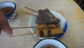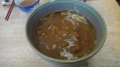 言います。最初に声をかけていただいた真ん中の店で、おでんとカレーそばを食べます。パン食べてますが...