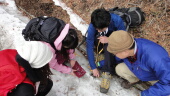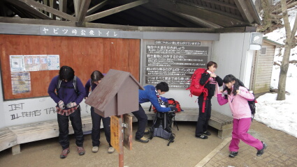 富士見山荘前でアイゼンが装着できないケイを囲んで集合写真