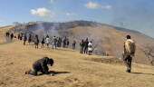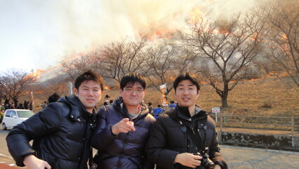 山に生えている藁を焼くイベントです。最初は組合の人が山道の近くの藁を焼きます。