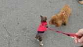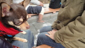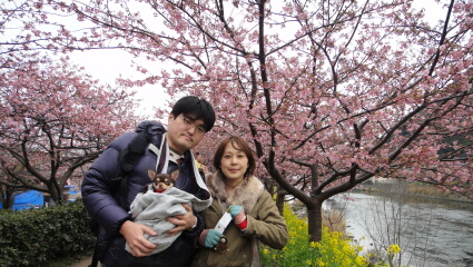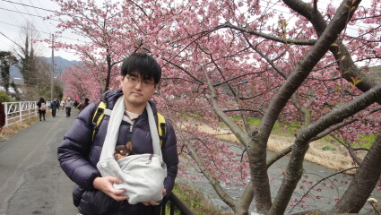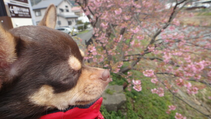 再び、川沿いを歩いて河津桜を見ます。お日様もでてきて気持ちがいいです。マロンも寝不足のようです。