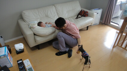 寝袋を貸してくれとのことで、急遽、宮内家に訪問に来ました。そして、マロンと岳の面倒を同時に見ます。