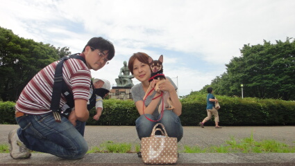 等々力緑地の入り口で家族写真です。無事、公園デビューしましたが、ずっと抱っこ紐で爆睡でした(笑)