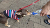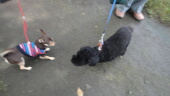 猫より小さいマロンちゃん。襲われないように注意しながら嫁さんが歩きます。等々力緑地と言えば、