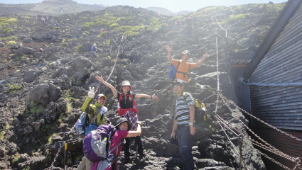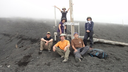1日目の山頂で集合写真です。大野くんは5回目、宮内は2回目、その他メンバは初めての登頂となります。