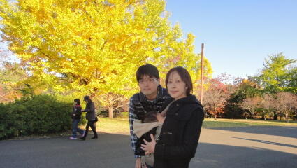 イチョウの黄色が眩しい場所で集合写真です。来年の紅葉ではマロンちゃんを連れて行こうと思います。