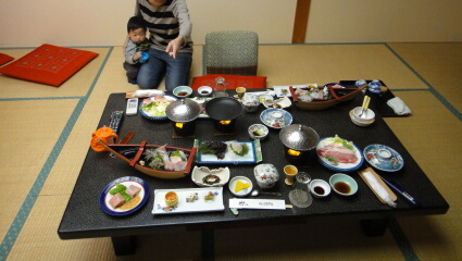 宿の大浴場に入ってから、部屋の夕飯です。松野明美のようなハイテンションの中居さんが運びます。
