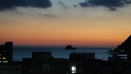 お部屋の景色は最高です。初島が綺麗に見えます。眠いですが、もう6時なので露天風呂に入ります。