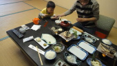 8時にお部屋で朝食を食べます。朝食にごはんに合うものが沢山でるので、御飯を4杯食べて、満腹です。