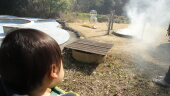 食後は焼き芋体験。新聞にくるんで、水をつけて、ホイルで巻くだけ。岳の年齢じゃ体験は無理ですね。