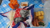 嫁の作ったおにぎり、玉子焼き、ソーセージと買ってきた焼き鳥を食べます。ビールも飲みます。