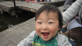 場所探しでかなりの距離を歩いて疲れちゃいました。岳くんの頭に桜の花びらがのって、超ハイテンションに