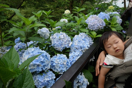 岳は爆睡に入りました。歩いて成就院に行きます。満開とはいえませんが、それなりに咲いた紫陽花。