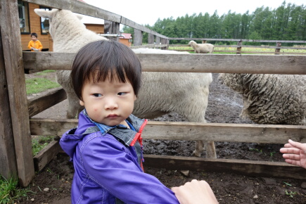 ホテルからタクシーで3000円。岳くんは始めての動物ふれあいです。羊がイッキにゆきひら鍋にいれた