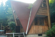 過言ではない。奇妙な形のログハウス。キャンセルしたい、高そうな気がする...。ログハウスに荷物を置き、