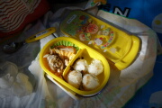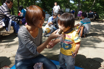 さて、山頂で山ごはんです。岳くんはお弁当を持ってきてます。パパとママはオニギリがあります。