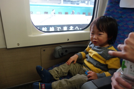 目的は新幹線と雪です。岳が初めて乗る新幹線と初めて触る雪です。でも、雪降ってるのか心配。