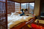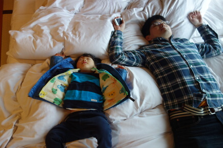 旅館に戻って岳は疲れたのか爆睡です。昆虫のような格好で寝ちゃいました。お父さんも同じ格好をして、