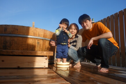 宿です。屋上の貸切露天風呂を無料で使えます。岳は風呂桶で足湯をしたら、とっても気に入ったようです。