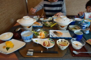 朝食です。朝風呂に入ろうと思いましたが、貸切温泉は他の人が使っていたので利用できませんでした。