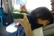 スーパービューではなくて普通の踊り子のグリーン車です。岳が寝たので、宿のお弁当は駅弁となります。