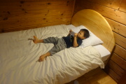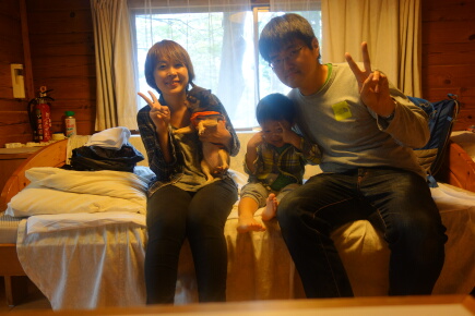 ロープウェイでスーっと戻ったところで、岳は爆睡です。箱根園コテージにチェックインします。