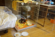 大きなゲージもあって、ペットグッズが揃っております。岳をベッドに寝かそうとしたら、起きちゃいました。