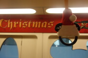 意外と早く帰れました。ディズニーリゾートラインはクリスマスで彩られており、つり革も帽子を