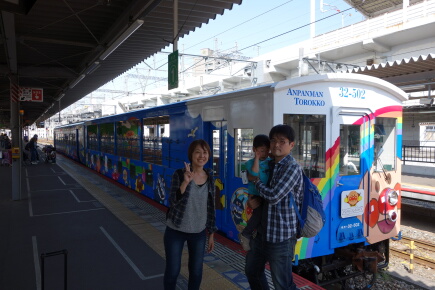 アンパンマントロッコへ乗ります。その後、坂出駅から倉敷に戻ってドーミーインに泊まります。温泉付きです。