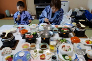 もらって、夕飯は豪華部屋食となりました。お宿は蛇口からみかんジュースが出るので岳は大喜びです。
