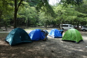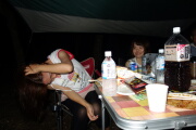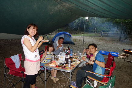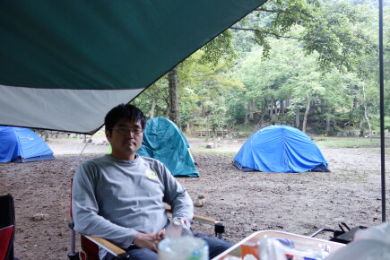 6人の参加なのにテントが5張り。贅沢キャンプです。王さんが女性陣をアッシーして、ビールで乾杯。