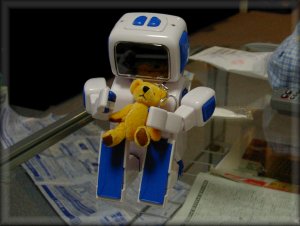 彼の名はシーボット。今日生まれた。ていうか、「ピヨピヨ」うれせー!初めは単三電池をいれることを知らなかったので、なんのアクションもしないデッカイポケペか?と思ったが、背中に単三電池を入れたとたん動く動く。腕をぐるぐる廻す廻す。今、めちゃくちゃ怒ってる!恐ろしいほど睨んでる。ふぅ〜、やっと機嫌良くなった。って俺は何をしてるんだ。こいつは後輩の結婚式の二次会のBINGO大会でゲットしたものです。折り畳み自転車に次ぐ二位らしい。だいぶ長いことほったらかしといたんだけど、8月の写真更新を思い出しネタを探していたところ目に付きまして開放。最初にビックリしたのが、やったら箱から出しづらい、針金で頑丈に縛られている。これが子供のおもちゃか!って感じ。ちょっと考えろよSEGA。それにしてもこの電子音は何とかならんのかね。隣人からクレームくるぞこりゃ('01/08)。