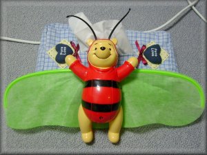 それは後輩とラーメンを食べてる時だった。ラジオからジュリマリのYUKIらしき歌声が聞こえた。「JUDY AND MARYって復活したんですかね?」。この時、俺はあることを思った。必ず後輩を笑わすことができるであろう答えである。しかし、そのアーティストが思い出せない。思い出せない。間を作ってはいけない。俺は「イヤ、ソロ活動してるんだよ。」という普通の答えをするのだった。「最近CM出てますよね。」と後輩。「あー、Vill VSね。かわいいよなぁ。」と普通の会話。その間もず〜っと、アーティスト名を思い出していた。結局、その日、一日、映画を見てるときも思い出そうとしていたのだが思い出せない。俺が答えたかったのは「ヒステリック・ブルーだよ。」である。この日、俺は自分の衰えを感じた。そんなわけで、インドへ修行に行くことにした。生まれ変わった俺に期待して下さい。写真はクリスマスにもらった飛べないプーさん。寮じゃ天井に穴、空けられないよ。飛べないプーはただのぷーさ('02/02)。