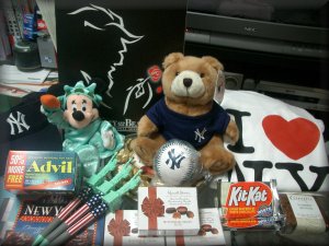 ニューヨークから無事に帰ることができました。でも、なんか咳き込んでます。もしかしてSARS?そういえば、行きの飛行機で咳き込んでるアジア人がたくさんいたし、帰りの飛行機は成田経由の香港行きなんていうとってもデンジャラスな便だったんですよね。ノースウエストってアメリカの飛行機のはずでしょ。乗ってるのがほとんどアジア人だったからね。僕らも含めて。そりゃSARSにもかかるわ。そんでもってよくよく考えてみたら、メジャーリーグの相手チームってトロントブルージェルズですよ。トロントといえば、再度SARSが広がる可能性ができたところですよ。トロントはニューヨークと隣り合わせですからね、当然、応援しに人が着てることでしょう。あの多くの入場者の中にSARS患者がいないとも限らない。ていうか、SARSっていったいなんだんだよ。いいかげんにしろよSARS!正体あたわして抗菌剤さっさと作れってーの。てなわけで、メジャーリーグで買ってきたニューヨークヤンキース熊ちゃんです。前回同様、お土産にかこまれております。この熊ちゃん、同期の送別会であげちゃいましたので、今は家におりません。てなわけで、エッセイでも書きましたが、今年中にもう一回ニューヨークに行って、熊ちゃんを買ってきますよ。はい('03/06)。